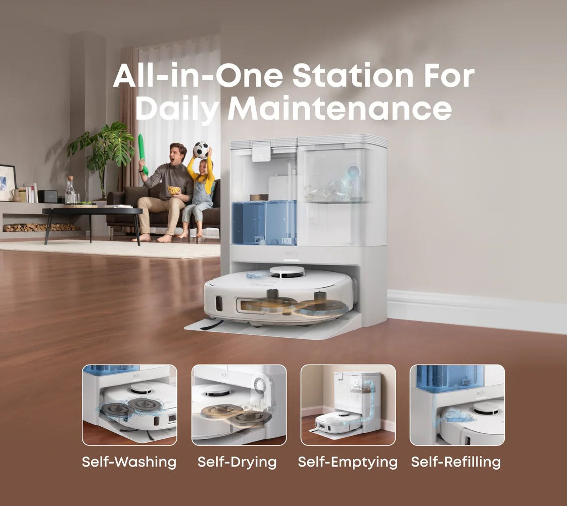 Fully automated system with auto emptying, mop washing, drying, and water refilling. Transparent water tanks let you easily check levels.