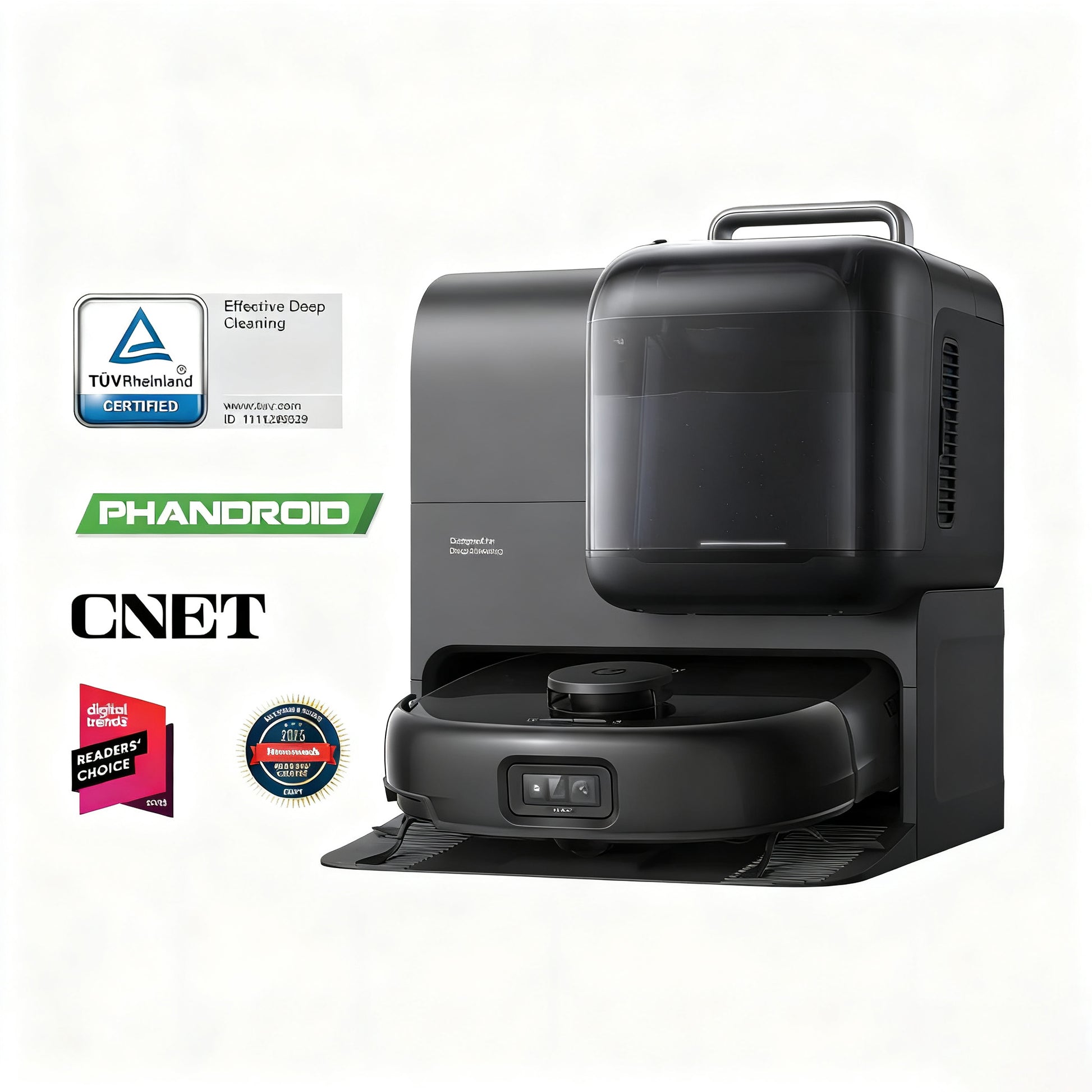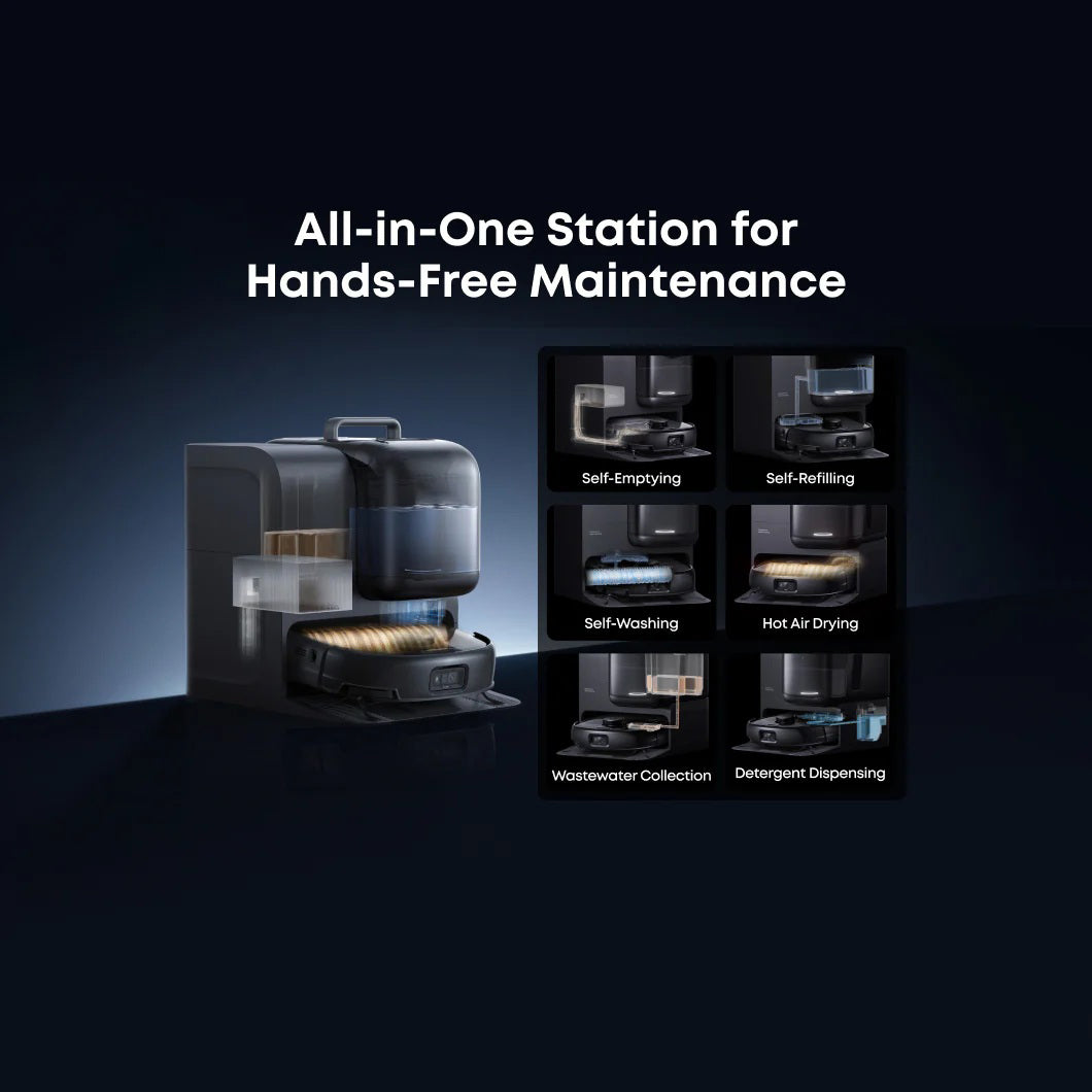All-in-One Station — Experience true hands-free convenience with automatic emptying, washing, hot air drying, detergent dispensing, wastewater collection, and refilling.